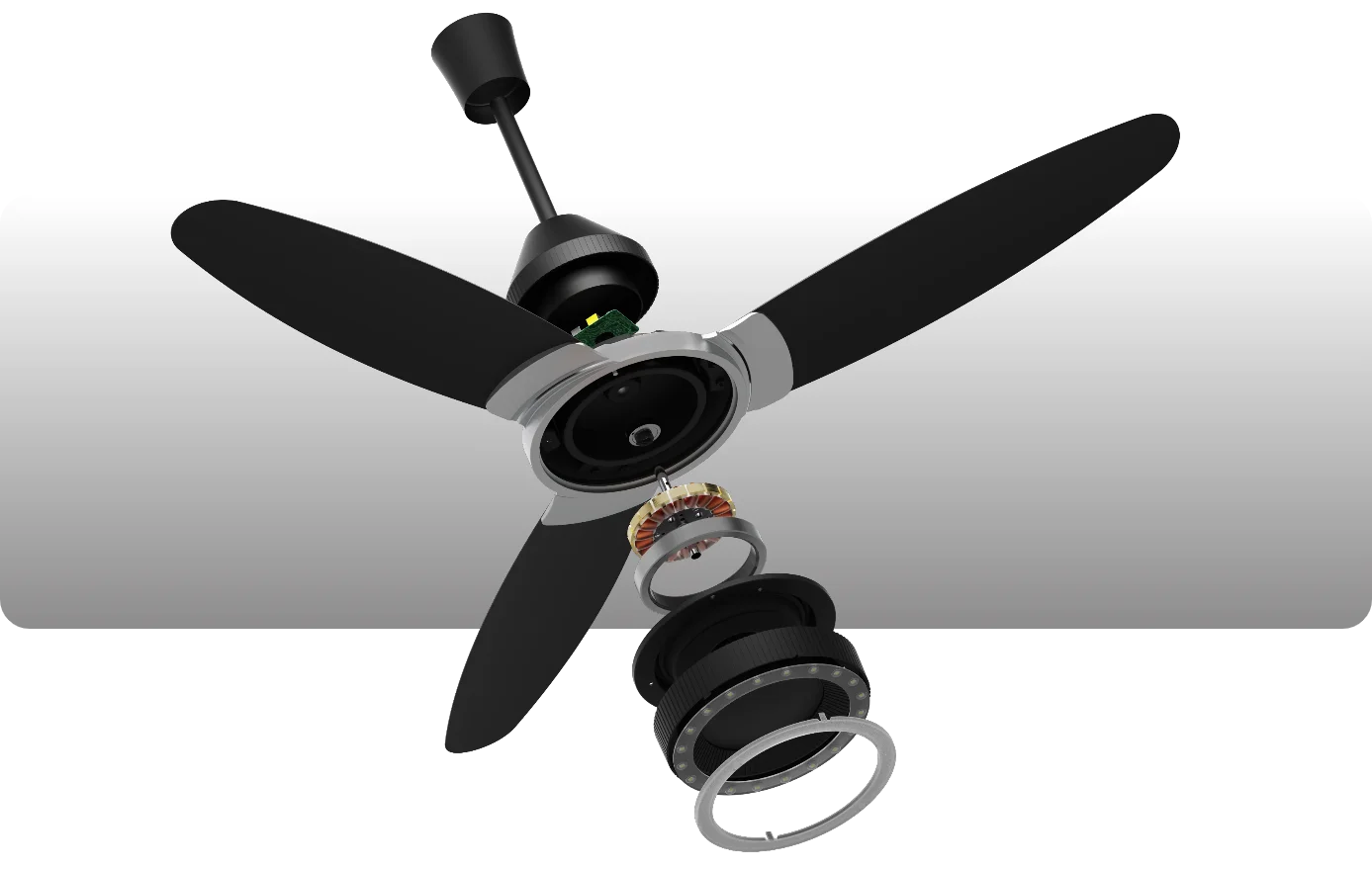 Combines BLDC motor efficiency with modern aesthetics and low noise operation. Ideal